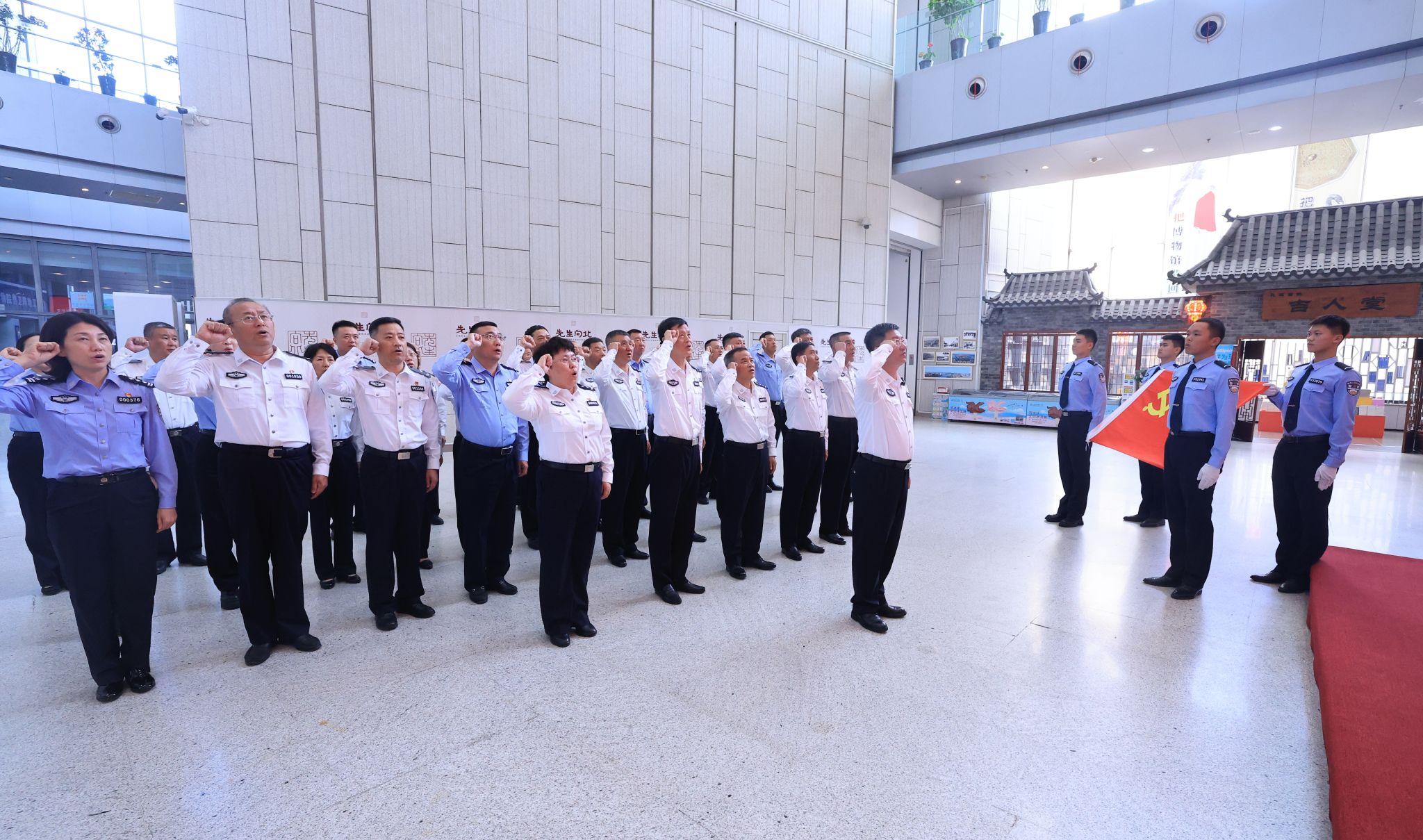 参观结束后,学院举行了重温入党誓词活动。全体党员整齐列队,面向党旗,高举右拳,在领誓人胡金刚的带领下,庄严宣誓。铿锵有力的誓言荡涤每一位党员的心灵,令大家回忆起宣誓入党的神圣时刻,坚定了不忘初心、为党的事业奋斗终身的决心。